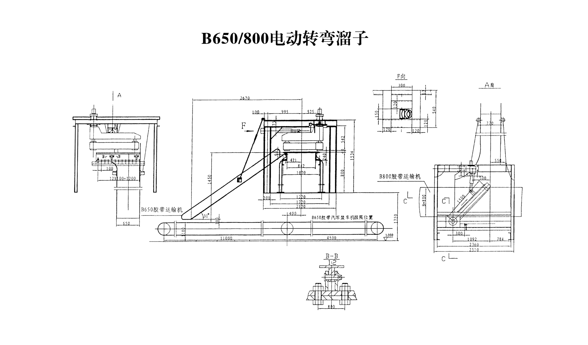 1、A向視圖中箭頭表示水泥包由B800膠帶運(yùn)輸機(jī)電動(dòng)轉(zhuǎn)彎溜子運(yùn)到B650膠帶機(jī)。
