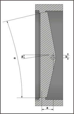 通常雙偏心蝶閥像b(偏離管道中心)和a(偏離密封面中心線)所示的那樣,目的是減少閥座與密封件之間大約15行程的摩擦;增加了一個特殊偏心角β,傾斜的錐形不僅克服了閥門啟閉中密封件和閥座之間的所有接觸摩擦,從而增加使用壽命,而且通過外加力矩的改變可以任意調(diào)整其密封比壓,使其密封更為可靠,絕不出現(xiàn)關過頭現(xiàn)象。